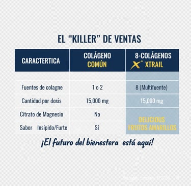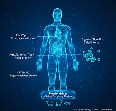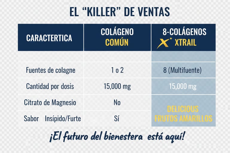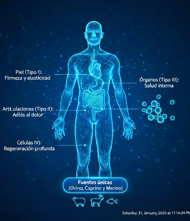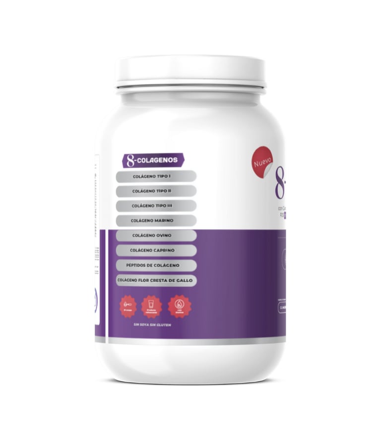 Fórmula con 8 tipos de colágeno para piel, huesos y articulaciones.